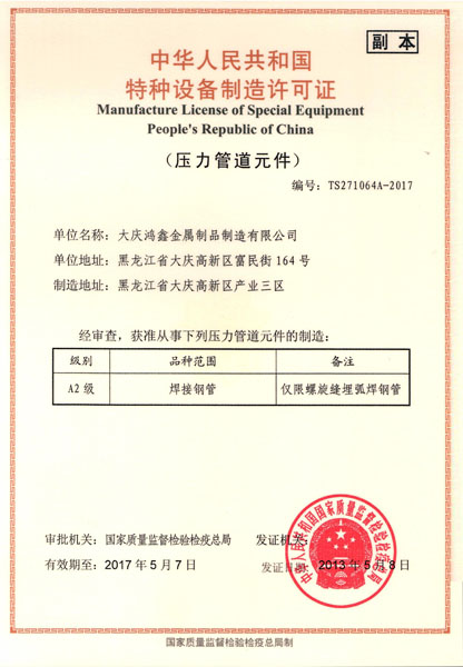 2006年4月20日,質(zhì)量監(jiān)督檢驗(yàn)檢疫總局發(fā)布了“國(guó)質(zhì)檢特〔2006〕162號(hào)《關(guān)于將石油天然氣工業(yè)用焊接鋼管等5類工業(yè)產(chǎn)品實(shí)行特種設(shè)備制造許可證管理的通知》。文件規(guī)定了自2006年5月1日起:停止受理鍋爐壓力容器用鋼管(含不銹鋼管)的工業(yè)產(chǎn)品許可證。轉(zhuǎn)為實(shí)行特種設(shè)備(壓力管道元件)制造許可證。